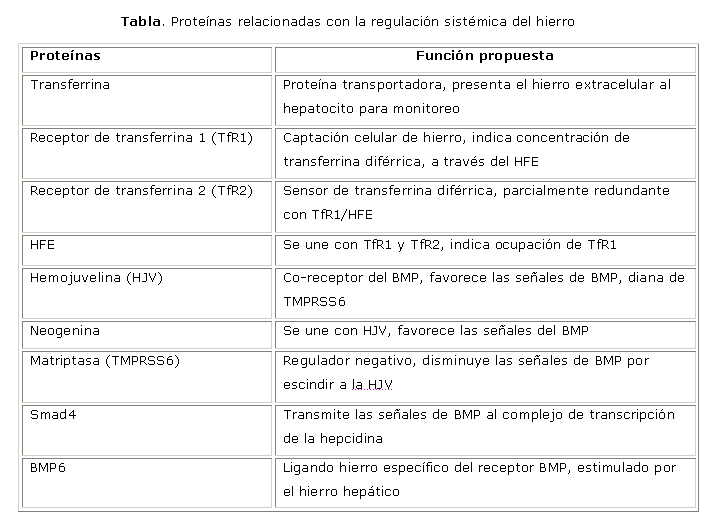 La regulación de la producción de hepcidina ocurre al nivel transcripcional, aunque hay evidencias de otro tipo de control. En ella participa una serie de moléculas implicadas en el metabolismo del hierro (tabla). Todas estas proteínas son susceptibles de sufrir mutaciones que pueden provocar la deficiencia de hepcidina y la consecuente sobrecarga de hierro, o la sobrexpresión de la hormona con la consiguiente deficiencia y secuestro del mineral en los macrófagos.3,9