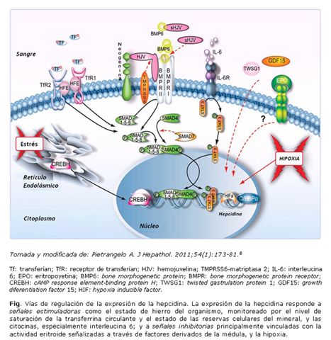 Para asegurar un suministro de hierro adecuado para las funciones celulares esenciales sin provocar toxicidad por hierro, requiere que sus concentraciones en plasma y fluidos extracelulares se mantengan entre 10-30 µmol/L. Desde hace algo más de una década se conoce que la hepcidina es un elemento central en la regulación del flujo de hierro al plasma, ya sea a partir de la absorción del mineral presente en la dieta (1-2 mg), el reciclaje de los eritrocitos (20 mg/d) o la movilización de las reservas en hígado y macrófagos (algunos mg/d de acuerdo con las necesidades).1,2