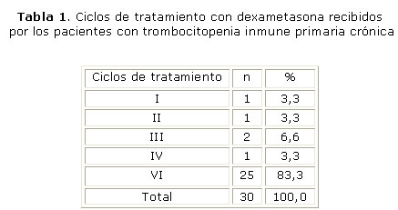 Los 17 pacientes que respondieron al tratamiento con dexametasona lo hicieron en los 3 primeros ciclos. El mayor número de respuestas favorables constituidas por 7 remisiones completas (41,2 %) se alcanzó al finalizar el primer ciclo (tabla 3). Entre los ciclos 4 y 6 ningún paciente obtuvo respuesta al tratamiento.